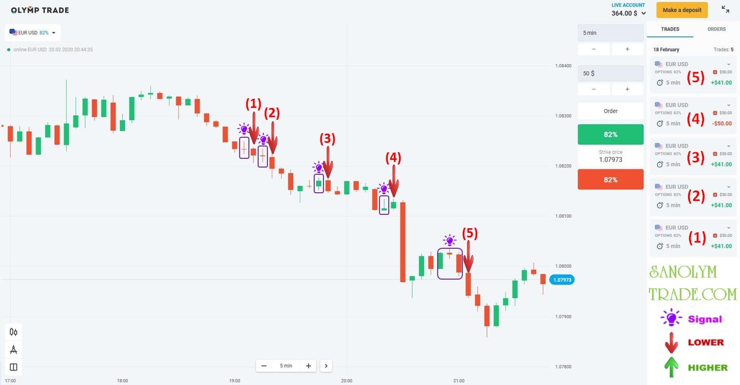 Setelah mengidentifikasi trend di Olymp Trade, selanjutnya adalah sinyal entri. Yaitu pola kandil dan indikator. Untuk mengidentifikasi sinyal dengan cepat dan akurat, Anda harus mempelajari ilmu pola kandil dan kandil khusus secara menyeluruh. Setelah belajar dan bertrading demo, Anda akan mengetahui kapan saatnya mengaplikasikan kandil dan indikator khusus untuk meningkatkan akurasi ke level tertinggi.